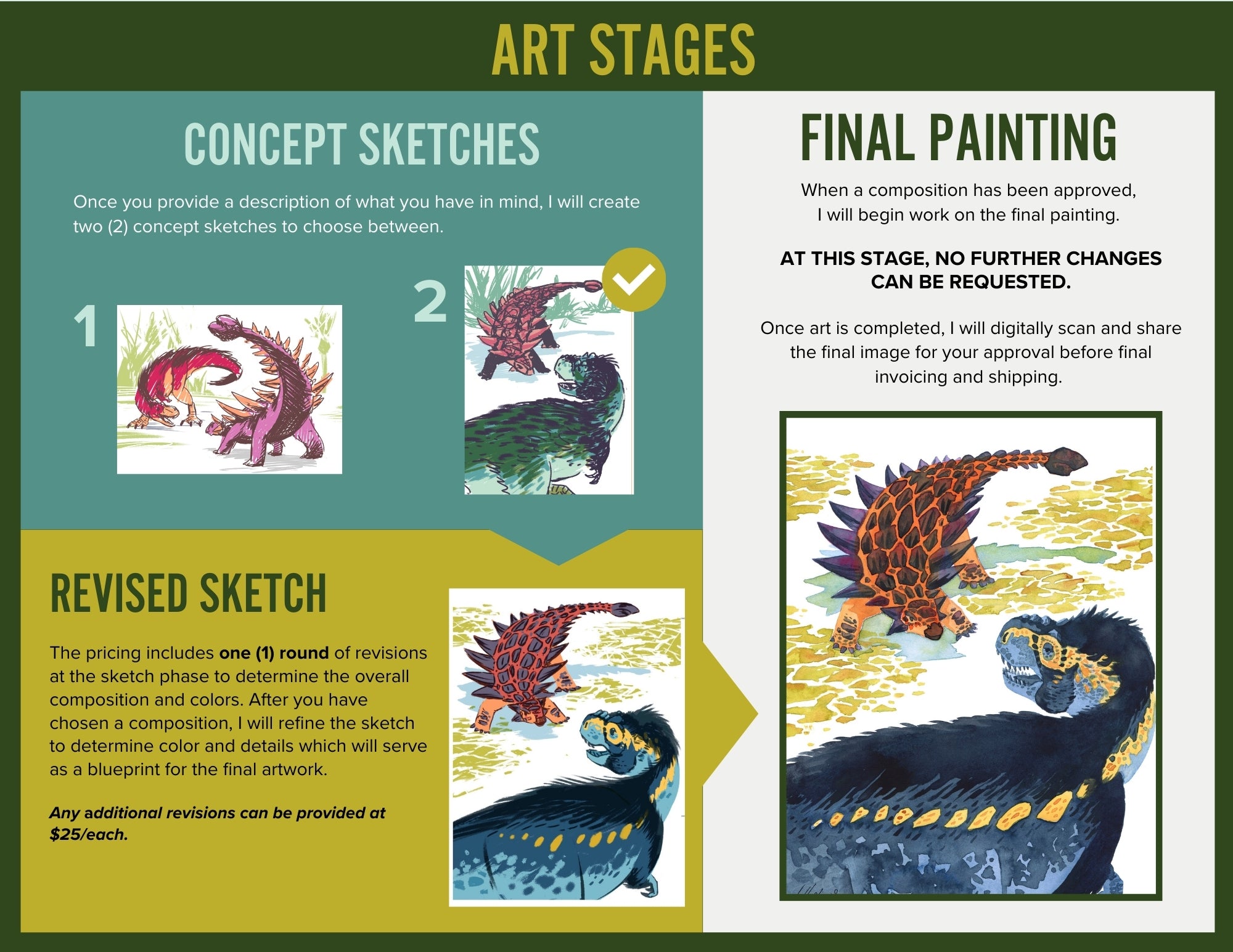 The pricing includes one (1) round of revisions at the sketch phase to determine the overall composition and colors. This is the last stage at which changes can be made.