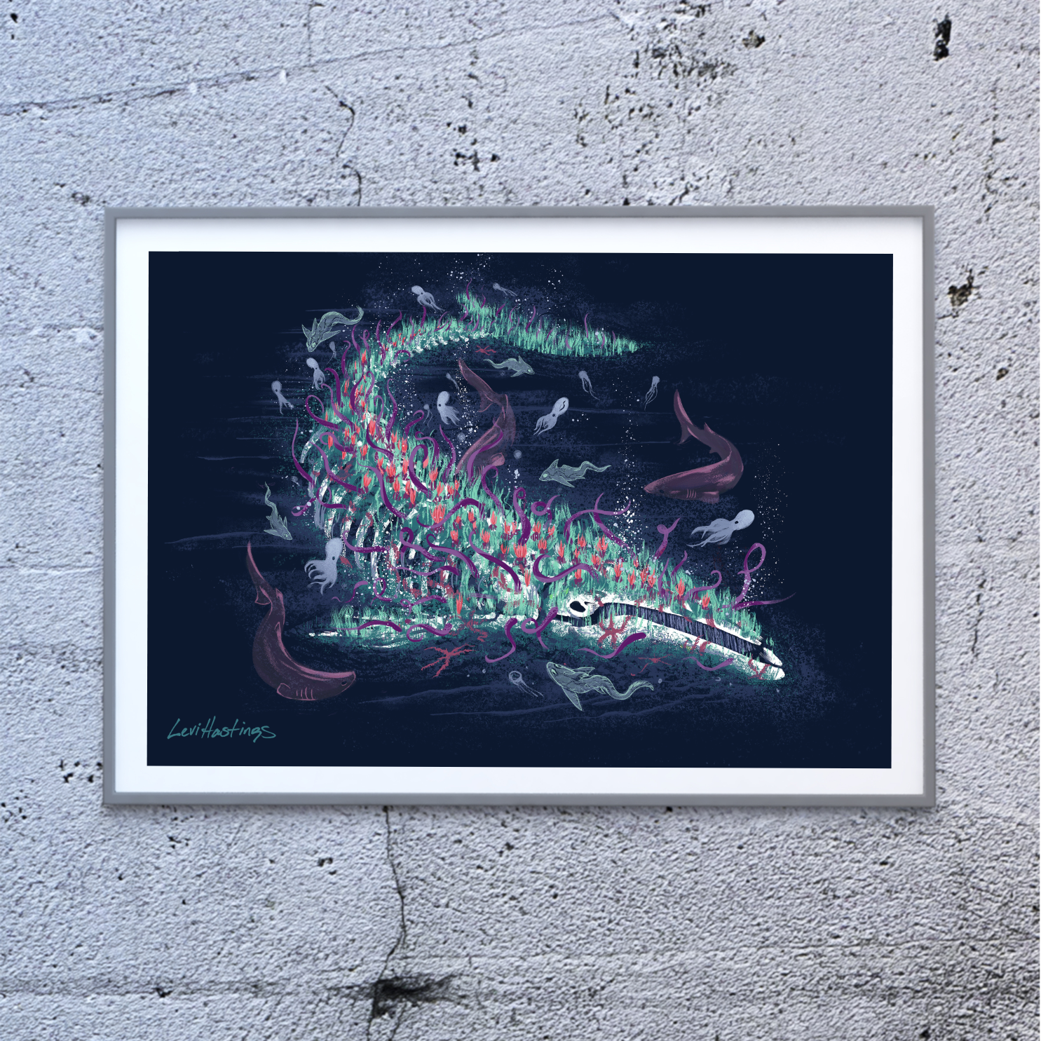 Have you heard Whalefall? This is the phenomenon by which the body of a dead whale sinks to the ocean floor and its mass becomes a major food source and habitat for a myriad of deep sea creatures. Like a nurse log in the forest, these Whalefalls can last for decades as the bones are slowly leeched of nutrients by microbes and bacteria.